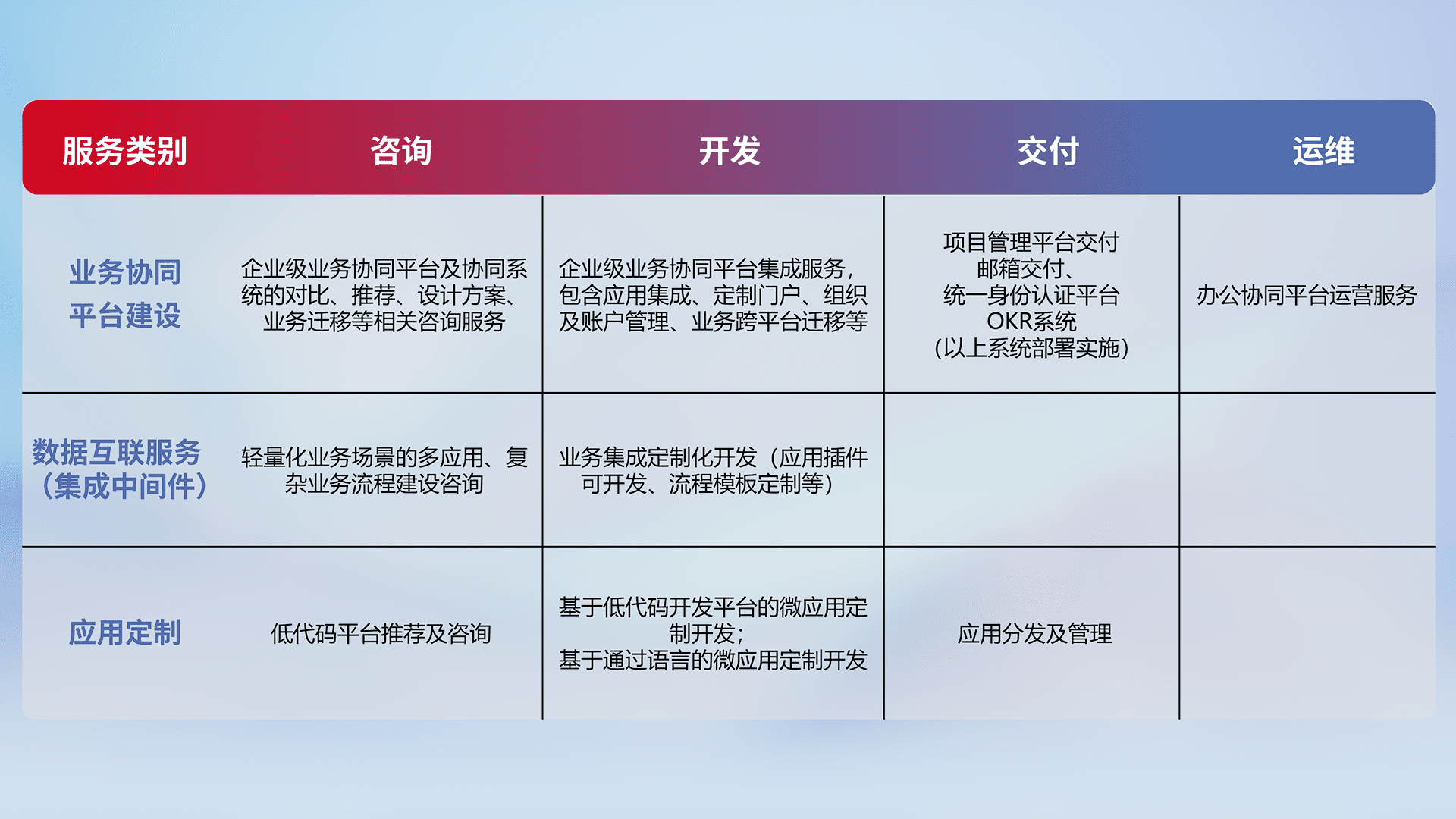 针对钉钉、、、企微、、、IDaas等平台级产品提供产品的规划、、、方案、、、、交付、、、定制化开发等服务,,实现如统一协同办公、、智能客户服务、、、、混合会议管理、、、智能数据查询、、等业务场景,,,实现数字化转型。。。。