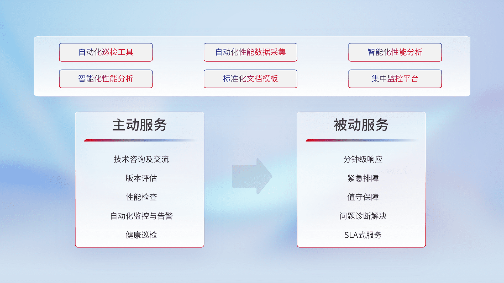 智能化工具和标准化文档,,,,保障服务质量,,提供主动服务(包含技术咨询、、、、版本评估、、、、性能检查、、自动化监控与告警、、健康巡检)和被动服务包含(分钟级响应、、紧急排障、、、值守保障、、、问题诊断解决、、、、SLA服务)。。